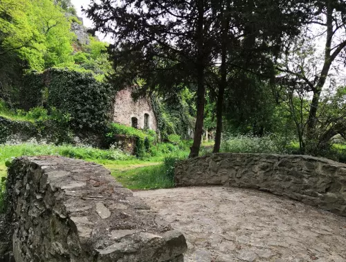 There are a number of points of interest on the menu for this very popular walk: the island with the causeway over the river, the old milling village, the tree-lined path at the top of the rock and the view of the Pope's farm, which was given to Pope Leo XIII at the end of the 19th century.